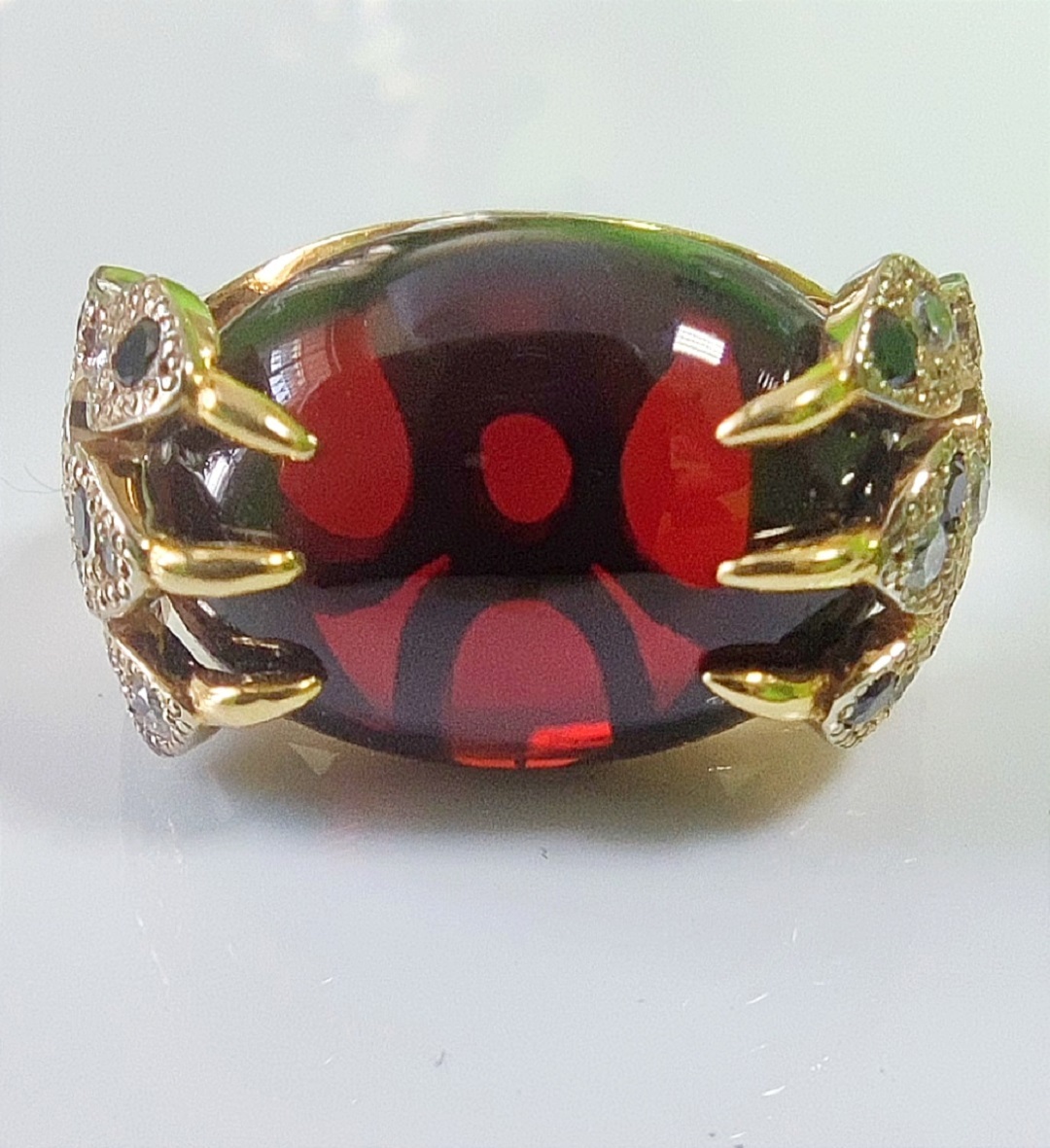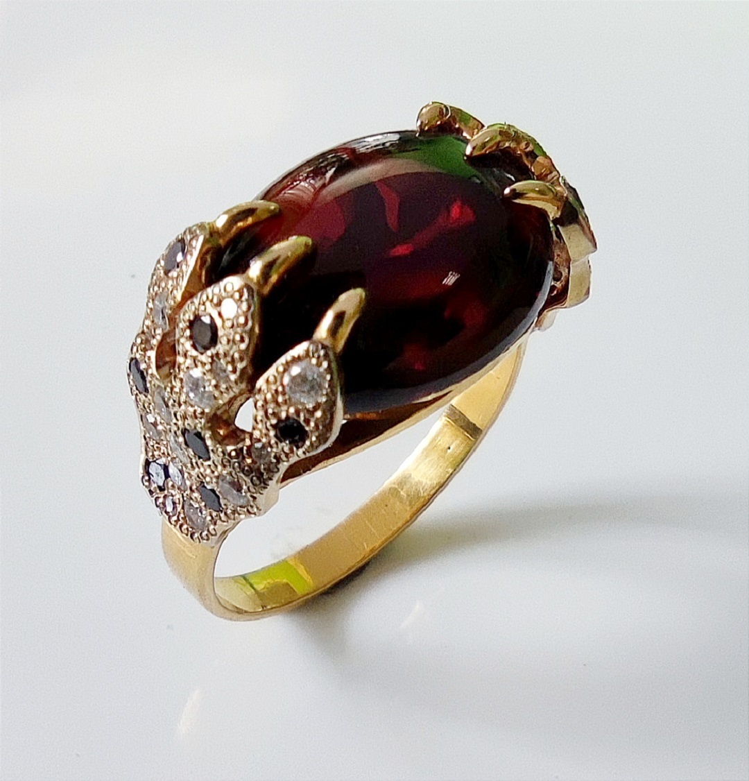 Вставки: Гранат 8.7 ct, 17Бр кр 57 0.255 ct 3/3, 10 бр кр 17 0.03 ct 3/4, 14 бр кр 57 0.21 ct чёрный